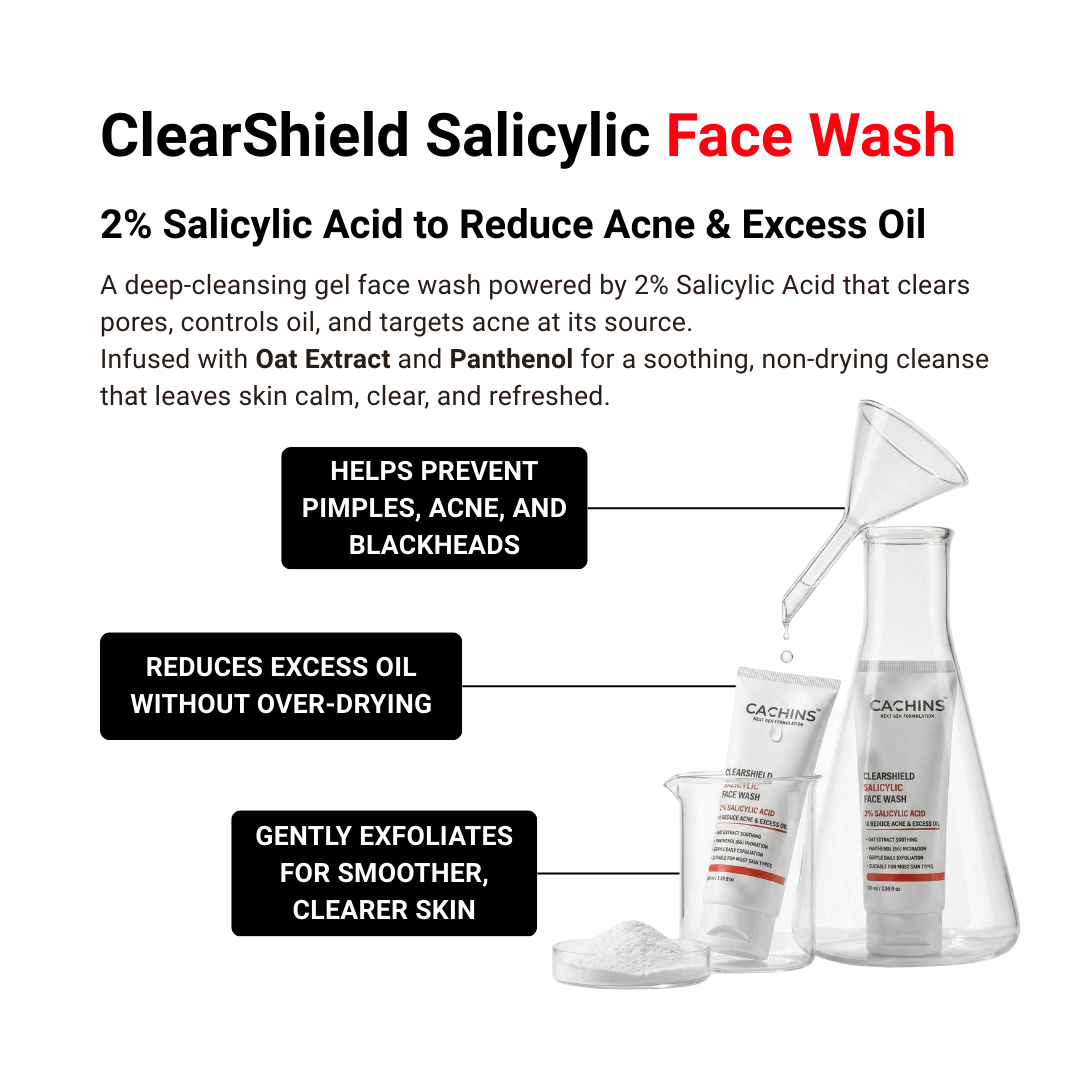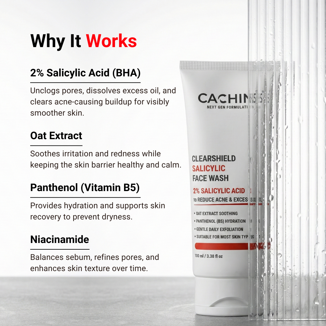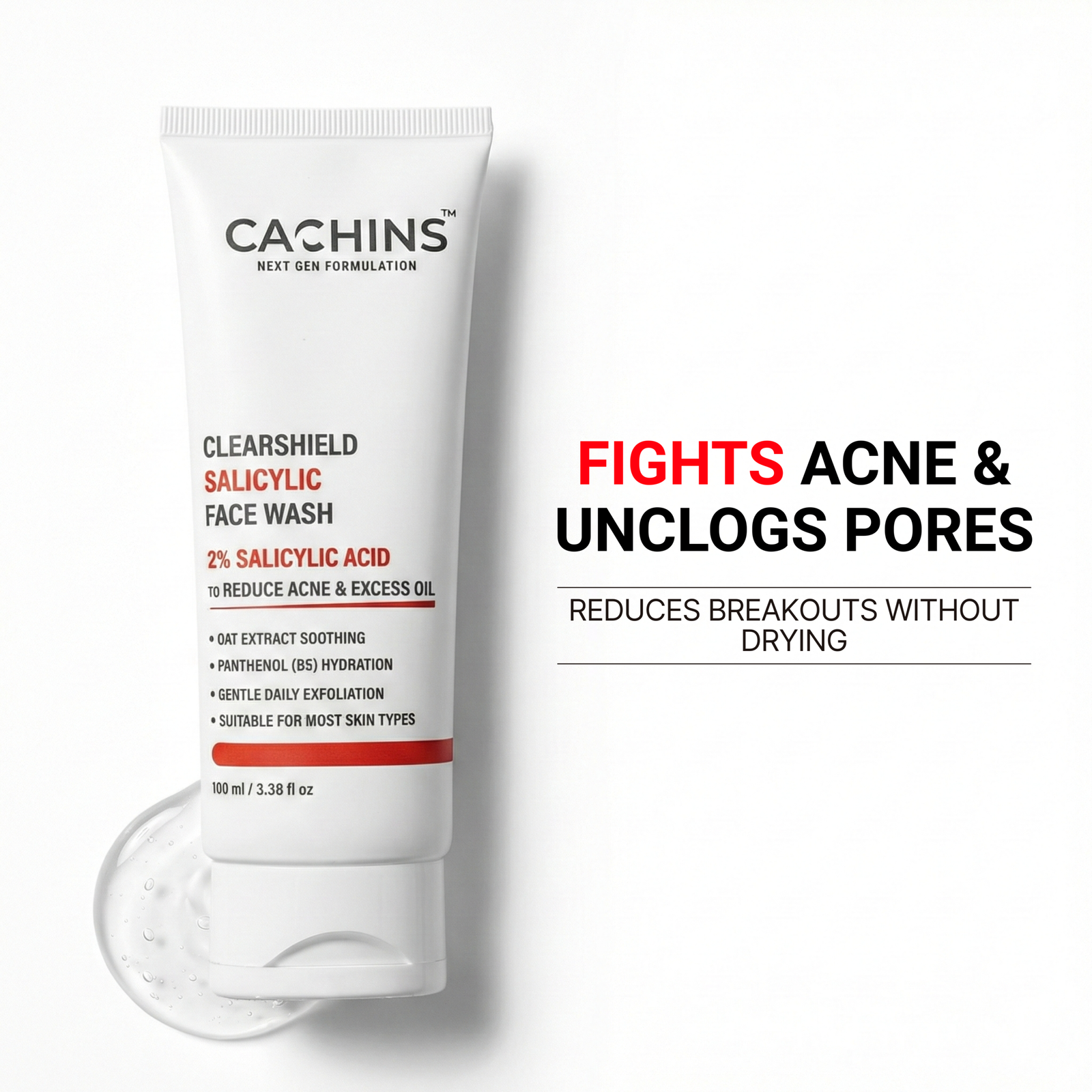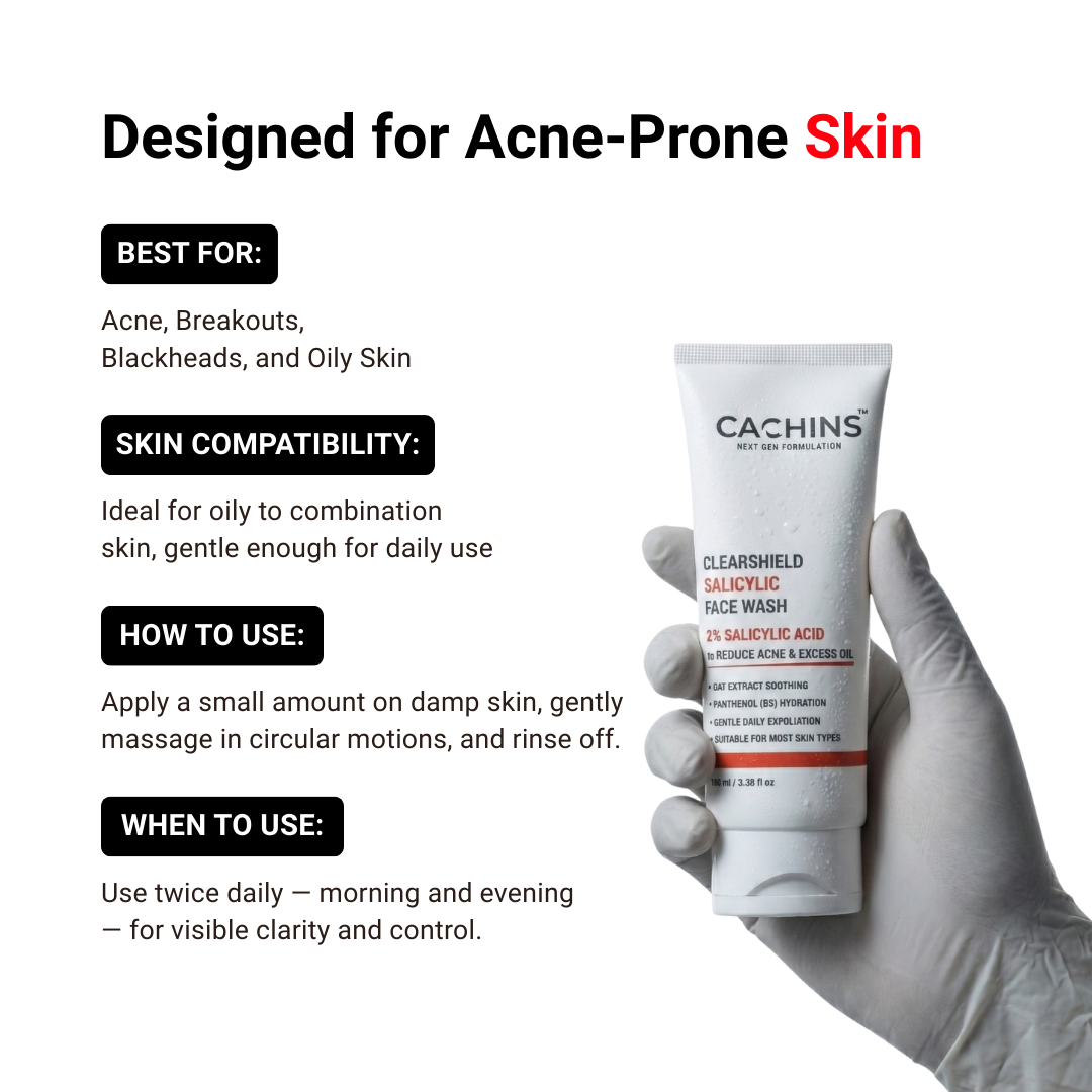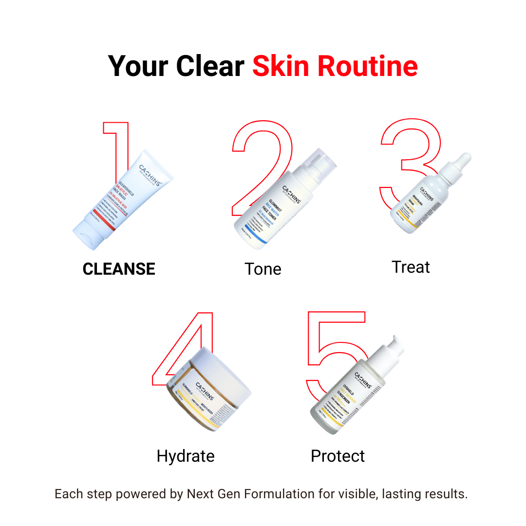 - Follow with CACHINS ClearGlow Serum and GlowShield Moisturizer for best results.