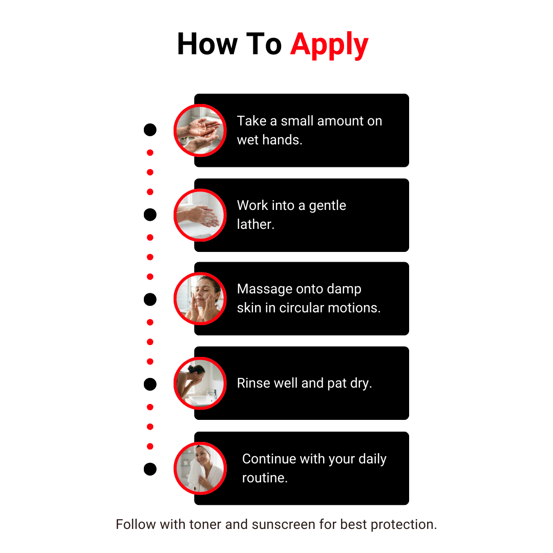 - Take a small amount of face wash and massage gently on damp skin for 20–30 seconds.