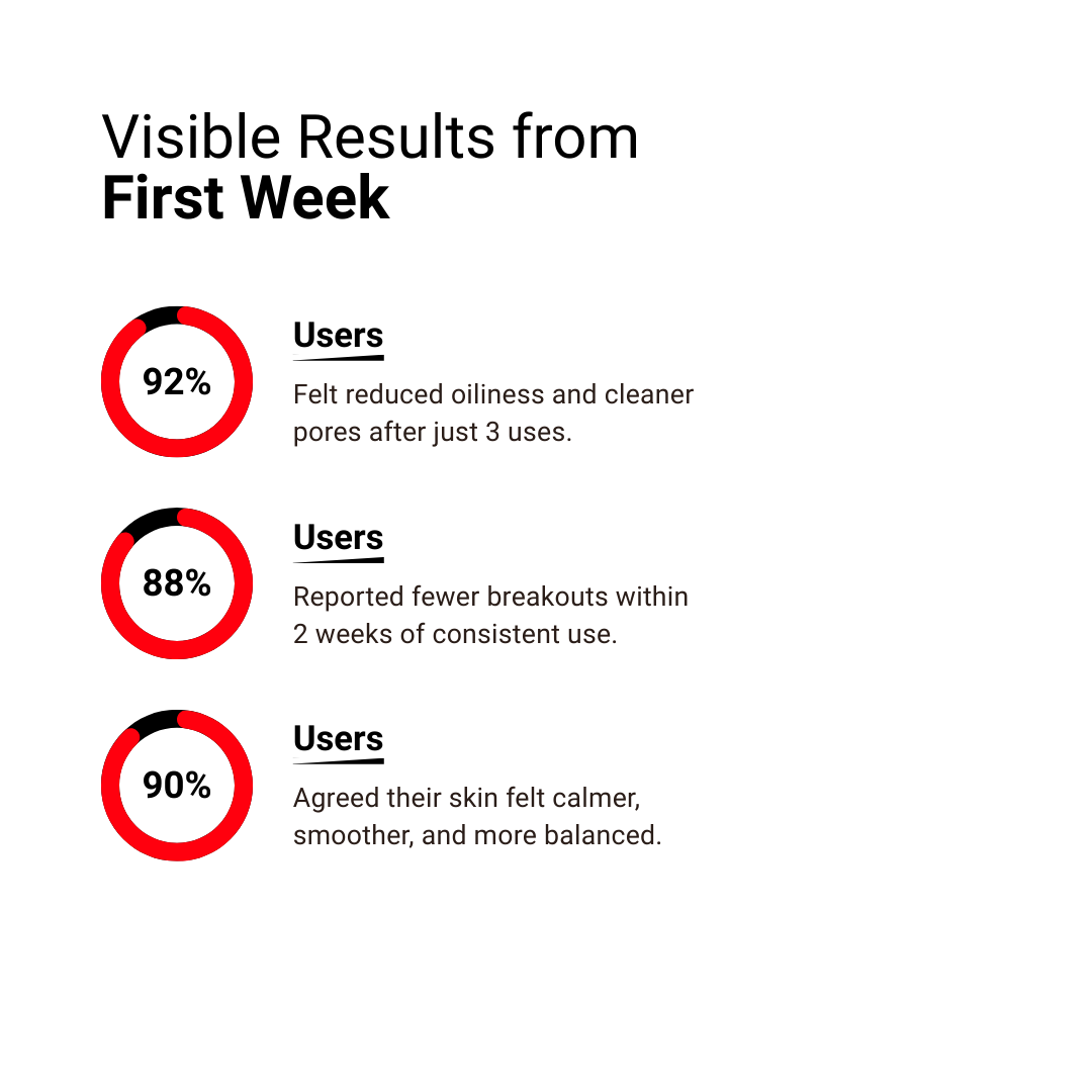 - 93% users reported reduced acne and oiliness after 2 weeks.